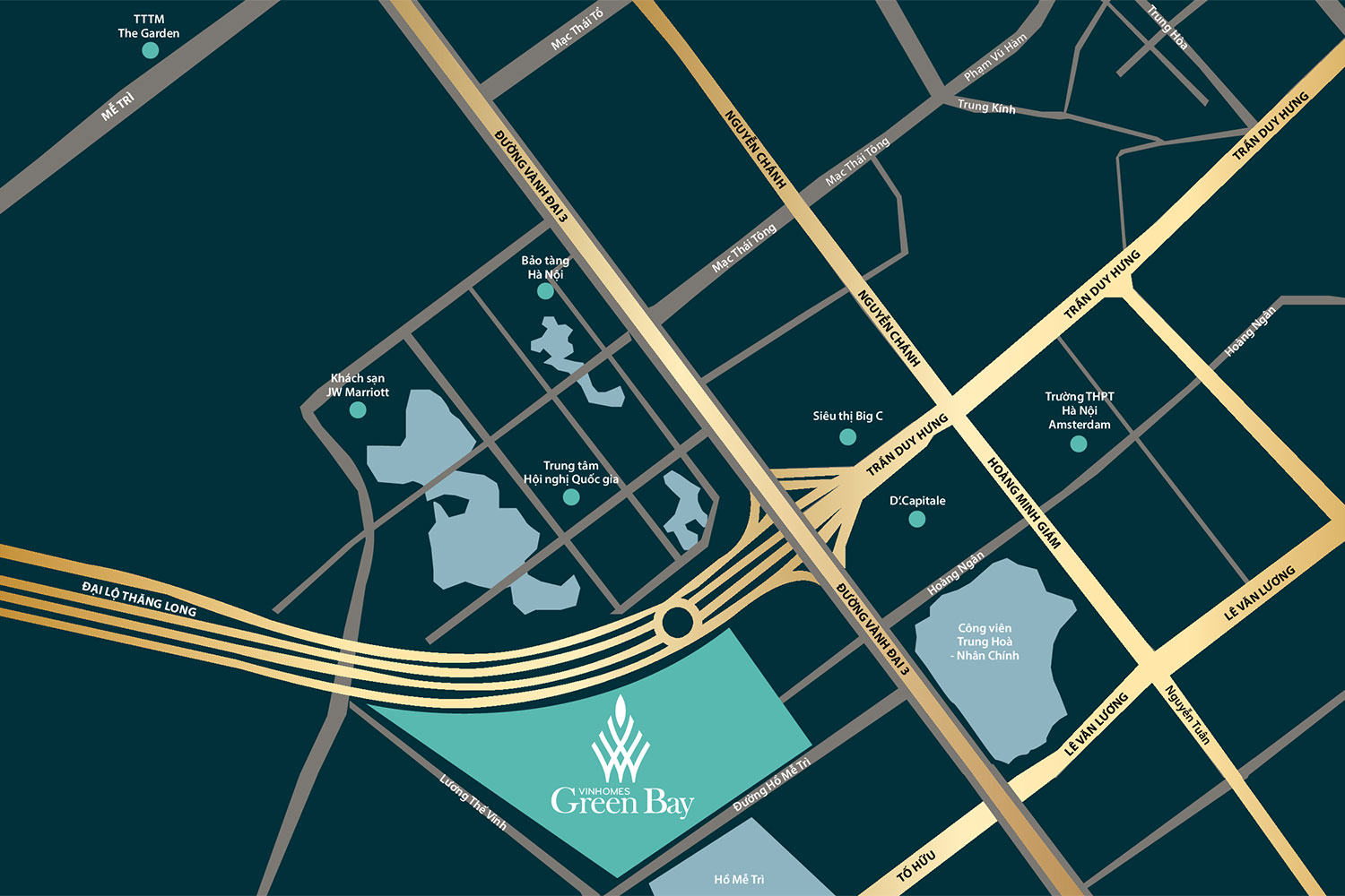 Vinhomes Green Bay là khu đô thị phức hợp cao cấp bao gồm căn hộ, biệt thự, liền kề và shophouse, toạ lạc trên khu đất rộng 31,8 ha mặt đường đại lộ Thăng Long, đối diện Trung tâm Hội nghị Quốc gia. Điểm nhấn nổi bật của dự án là hồ điều hòa rộng 8 ha nằm trọn trong nội khu, kết hợp với hệ thống tiện ích xanh phong phú, mang đến không gian sống gần gũi thiên nhiên hiếm có. Nhờ đó, Vinhomes Green Bay Mễ Trì được ví như “vịnh xanh giữa lòng đô thị” – một chốn an cư lý tưởng giữa trung tâm phía Tây Hà Nội.